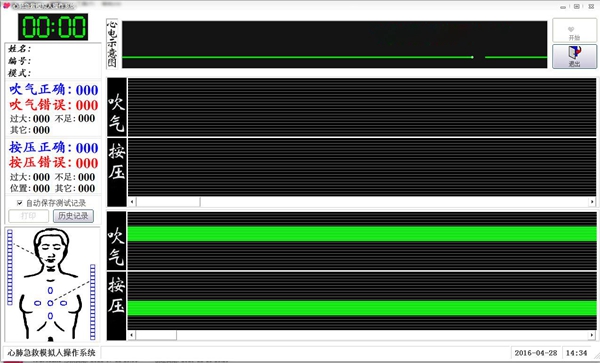 當(dāng)訓(xùn)練或考核操作時(shí)間結(jié)束后,即可進(jìn)行成績打印。按壓、吹氣正確錯(cuò)誤的次數(shù)及具體錯(cuò)誤原因,按壓、吹氣所產(chǎn)生的圖表數(shù)據(jù)統(tǒng)計(jì)、受訓(xùn)人的姓名、編號(hào)、成績、等功能打印,以供考試成績?cè)u(píng)定及存檔。